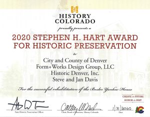 On January 31, 2020 Form+Works was honored to receive two awards at the History Colorado 2020 Stephen H. Hart Awards for Historic Preservation; one for the restoration of the Crested Butte Mountain Heritage Museum (aka Tony’s Conoco) and one for the rehabilitation of the Bosler Yankee House. We are absolutely honored to have worked on these buildings and to have been part of the great teams who made them possible. History Colorado put together videos about these and all the Hart awardees. To watch the videos click here